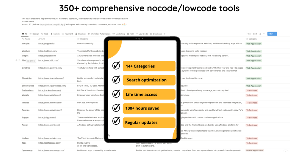 Lifetime access to 350+ no-code and low-code tools Notion database.
